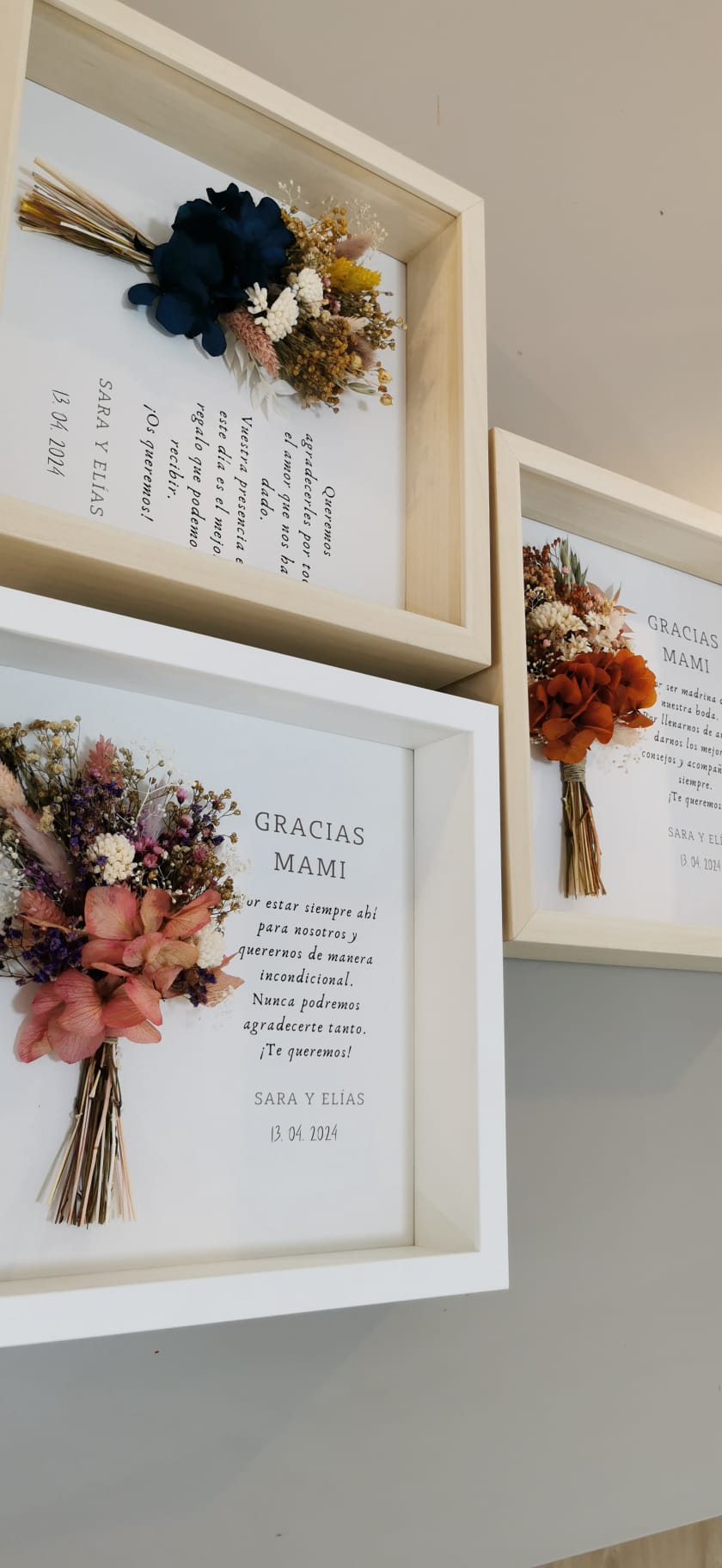 You can choose from different framed replica versions: Floral letter with text, Mini bouquet with long side text, Mini bouquet with text and date below. You can also make replicas without text or single letters without text.