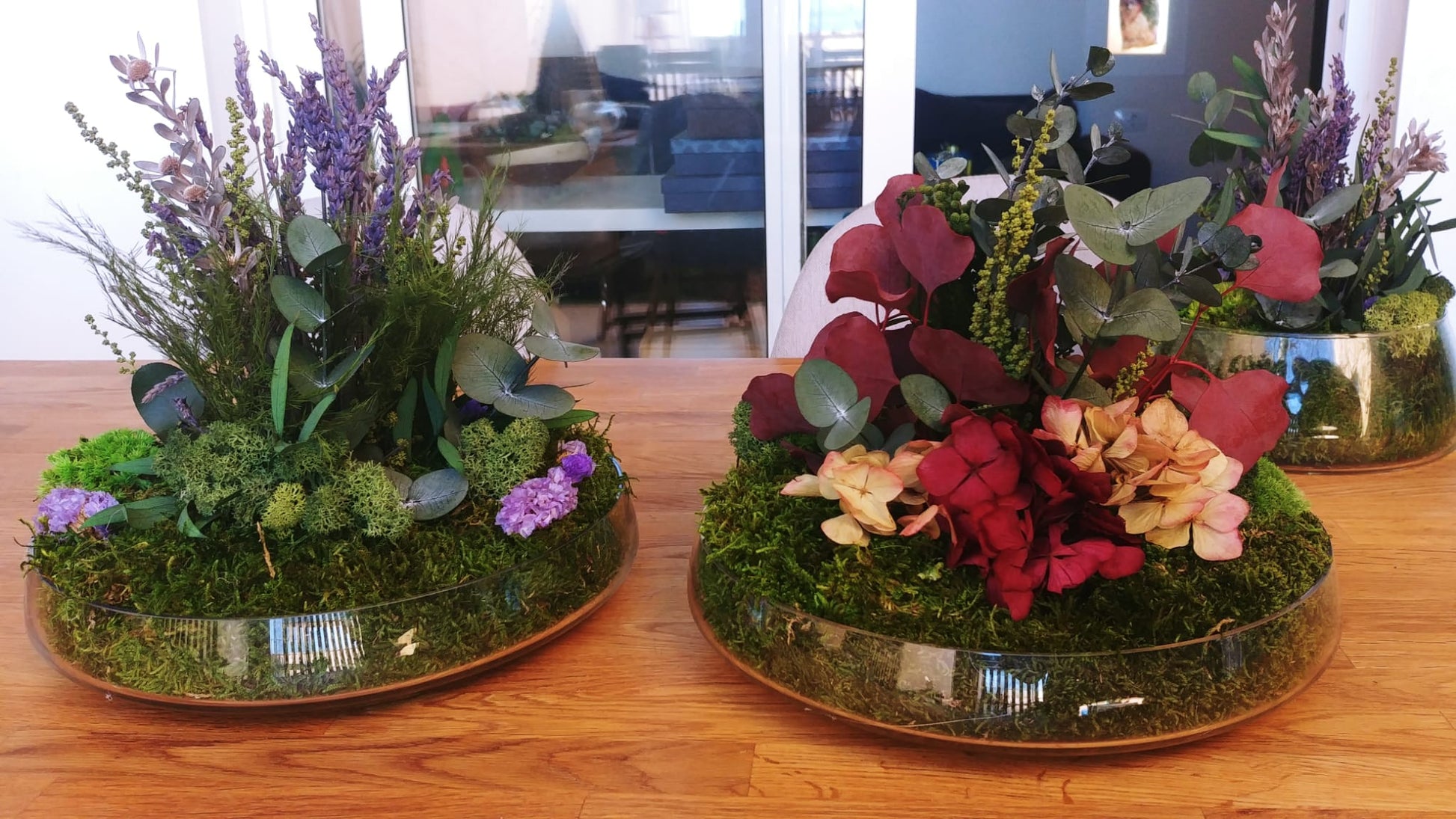 Taller de nuestro centro icónico Nature. Arreglo floral sobre base de cristal y Musgos.