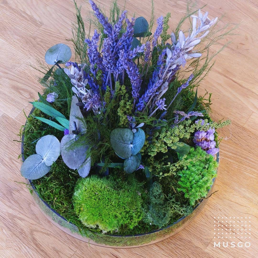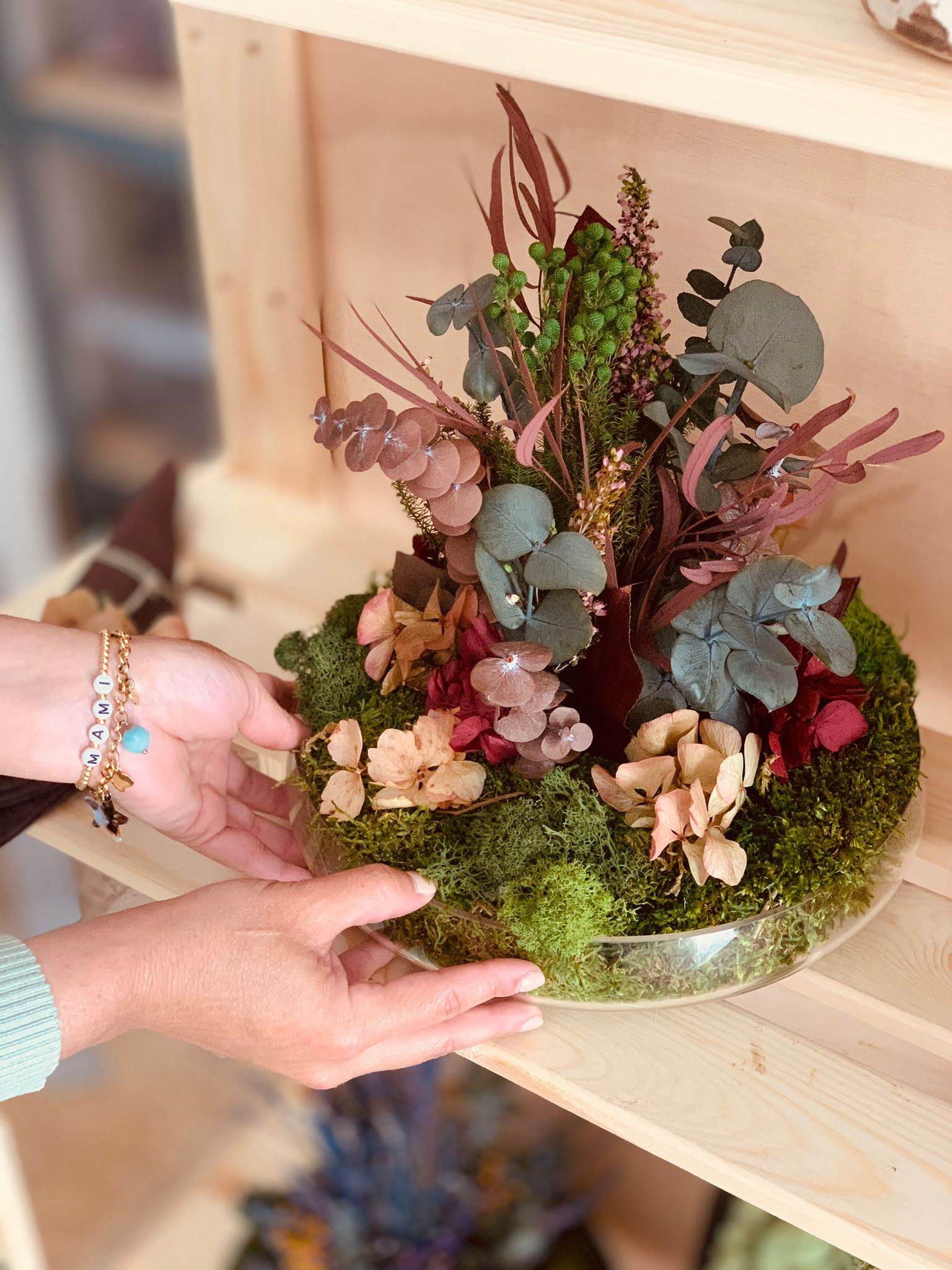 - Podrás elegir gama cromática floral en el taller. La base del arreglo en con Musgo y liquen y la parte superior podrás hacerla a tu gusto. Todas las plantas y flores son naturales preservadas por lo que estarán contigo durante mucho tiempo.