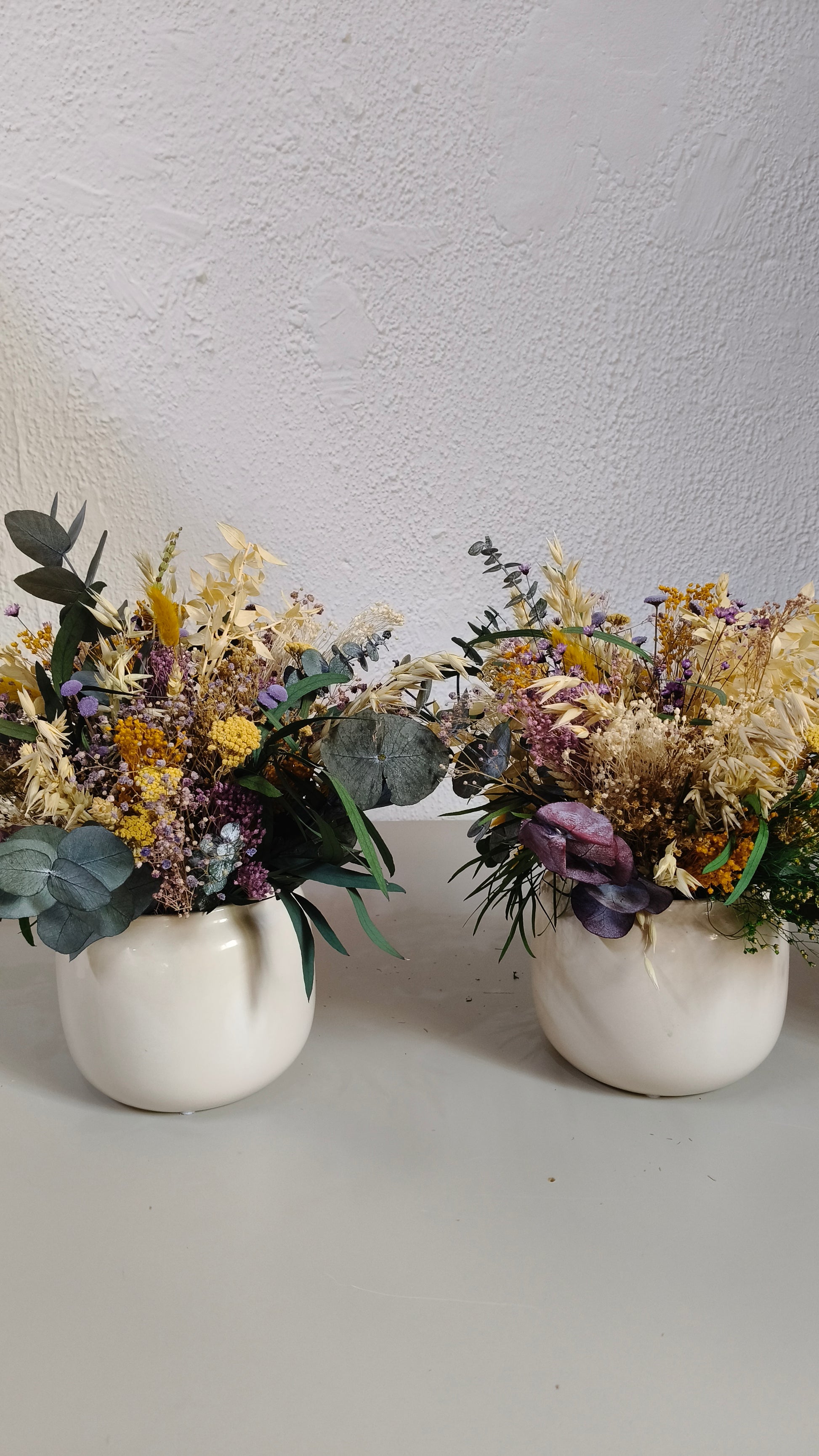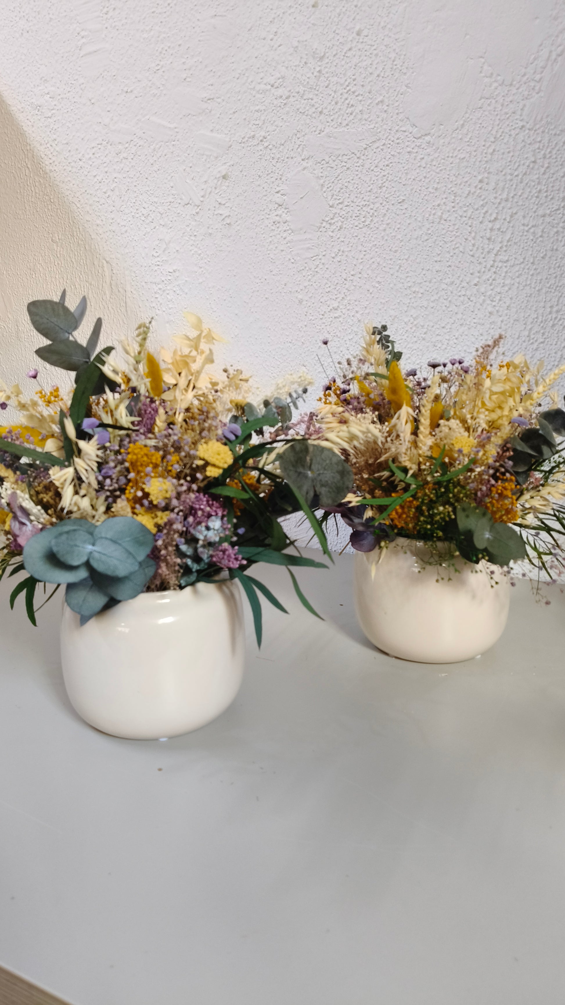 - Podrás elegir gama cromática floral en el taller. La base del arreglo es un jarrón de cerámica en tono rosa muy nude que combinará con cualquier espacio donde lo pongas por sus líneas suaves. Todas las plantas y flores son naturales preservadas por lo que estarán contigo durante mucho tiempo.